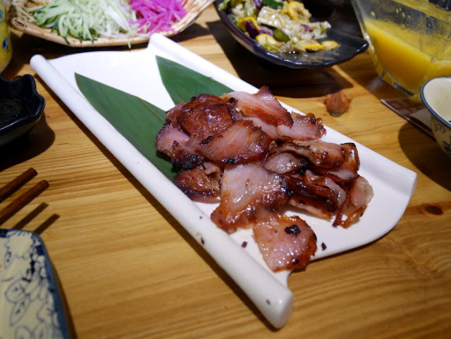 春餅的肉餡是額外點的,本來是點了一個牛肉,但沒貨了改選炭烤豬頸肉,味道也不錯。雖然春餅標準搭配是京醬肉絲,但本日午餐剛好就是京醬肉絲夾豆腐皮,著實不想再吃一回,在點的其他肉類,尷尬的是友人說他下午零食吃太多吃不太下,我挺無言,只好都吃了